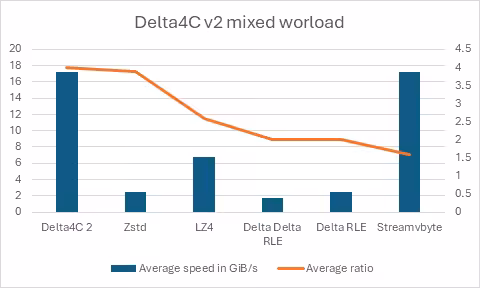 Compared to other algorithms on a mixed workload of data, the average compression ratio of Delta4C is seven times faster than ZStd!